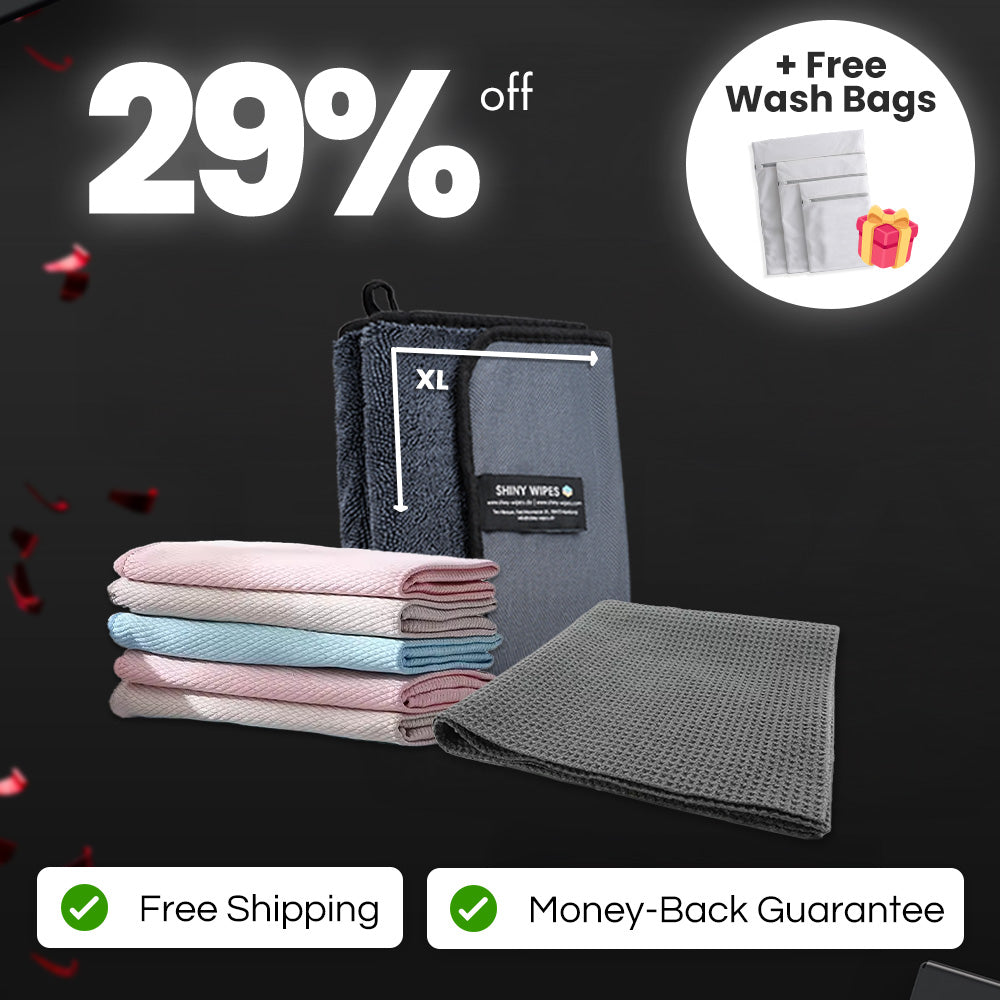 Everything you need for a spotless, streak-free shower without the hassle! The Spotless Shower Bundle includes our bestselling Shiny Bath™ XL Drying Towel, a set of 5 Shiny Wipes™ All-Purpose Cloths, and the XL Window Cloth for crystal-clear glass. Get 29% off compared to buying individually, plus enjoy free shipping, a 30-day money-back guarantee, and a free set of washing bags to keep your cloths in top shape.
